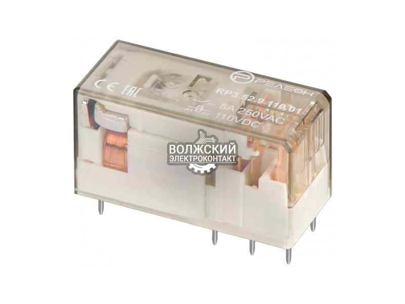 Низкопрофильное реле, 2 перекидных контакта 8А (110В DC) - герметичное, прозрачный корпус