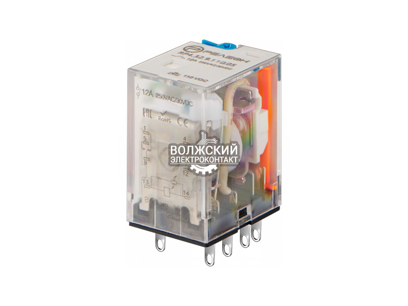 Промежуточное реле, 2 перекидных контакта 12А (110В DC) блокируемая кнопка проверки, светодиод