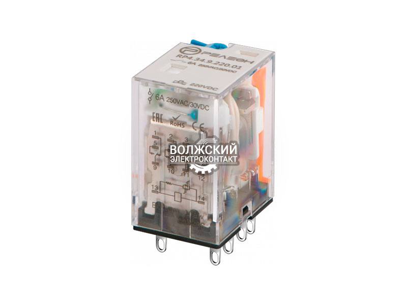 Промежуточное реле с нормированным коэффициентом срабатывания 0,65 Un, 4 перекидных контакта 6А (220В DC) блокируемая кнопка проверки, светодиод