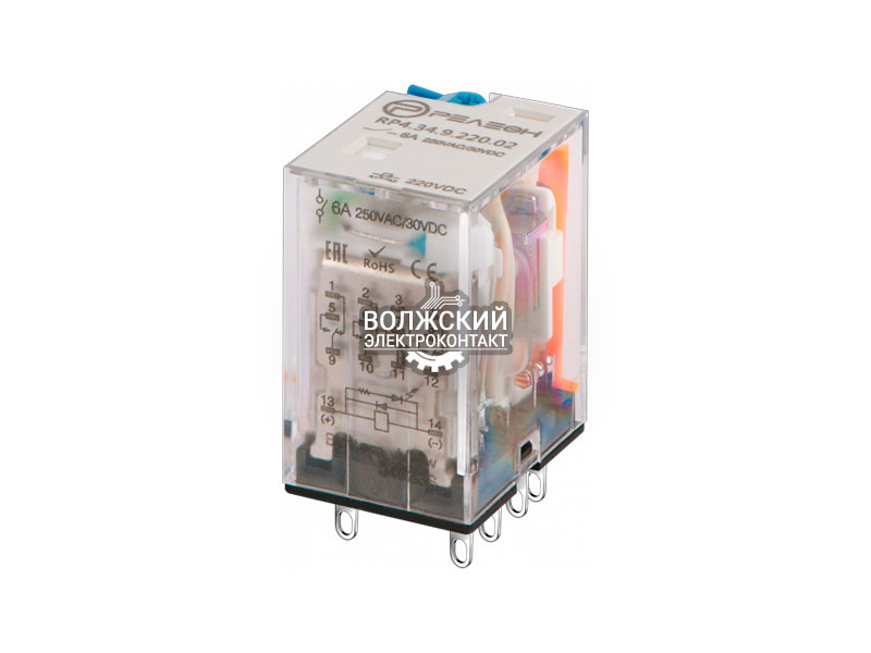 Промежуточное реле с нормированным коэффициентом срабатывания 0,65 Un, 4 перекидных контакта 6А (220В DC) блокируемая кнопка проверки, светодиод, диод (A1+)