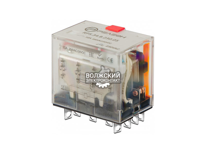 Миниатюрное силовое реле, 4 перекидных контакта 10А (230В AC) блокируемая кнопка проверки, светодиод